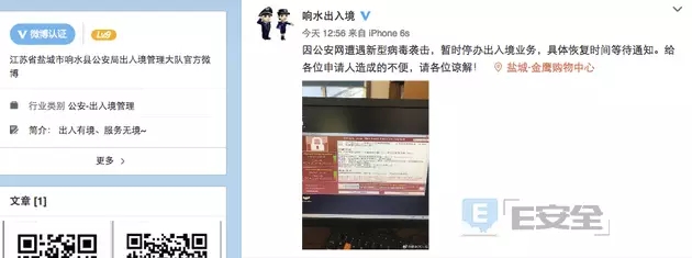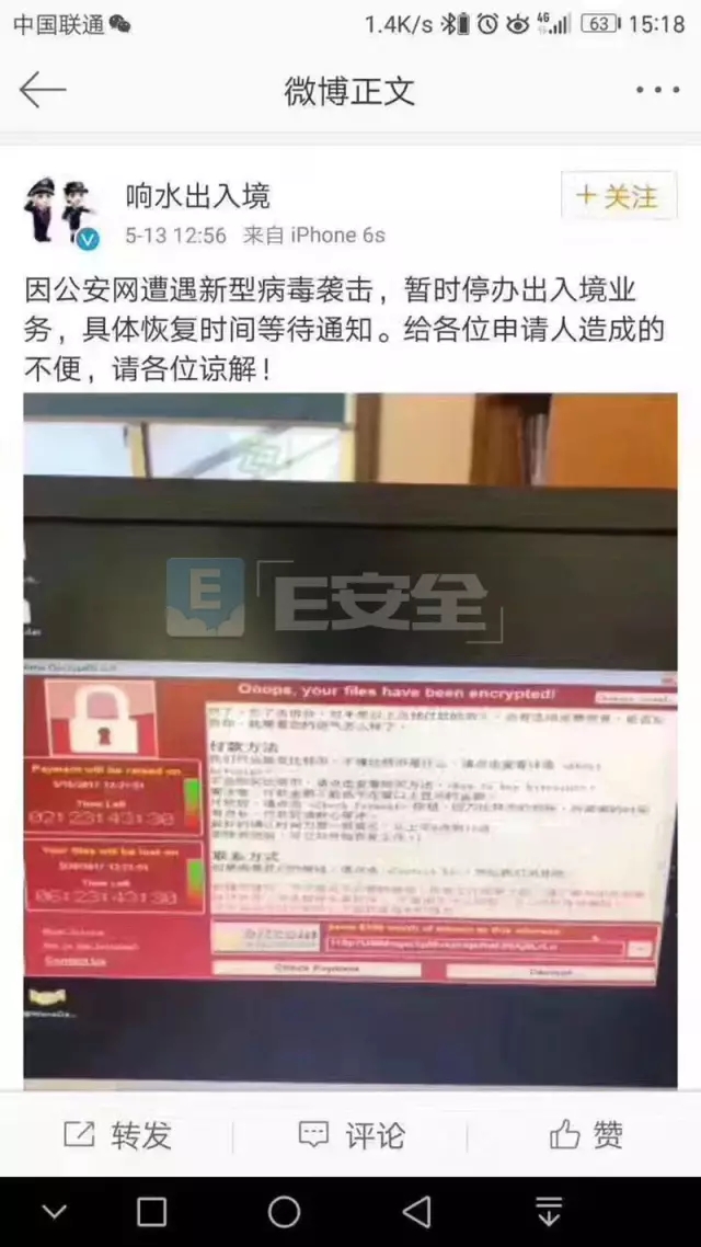 我國的政府部門網(wǎng)絡很多都跟教育網(wǎng)互通,部分政府機構也被勒索病毒感染受到影響。微博上一些用戶開始反饋,今日北京、上海、江蘇、天津等多地的出入境、派出所等公安網(wǎng)也疑似遭遇了病毒襲擊。
