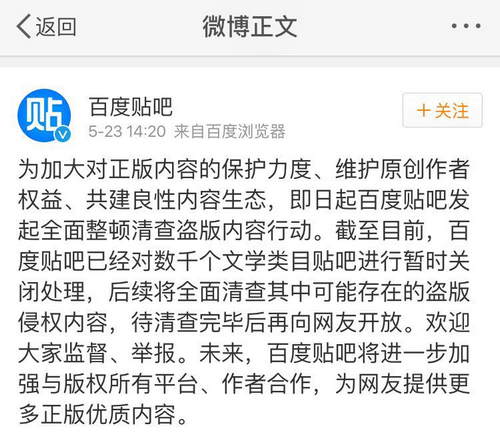 雖然百度方面并未解釋為何此時展開該行動,不過在519日,因手機百度App等平臺涉嫌侵權(quán)閱文集團白金作家辰東的作品《完美世界》,百度被閱文集團告上法庭。該事件可能是百度清查盜版的原因之一。