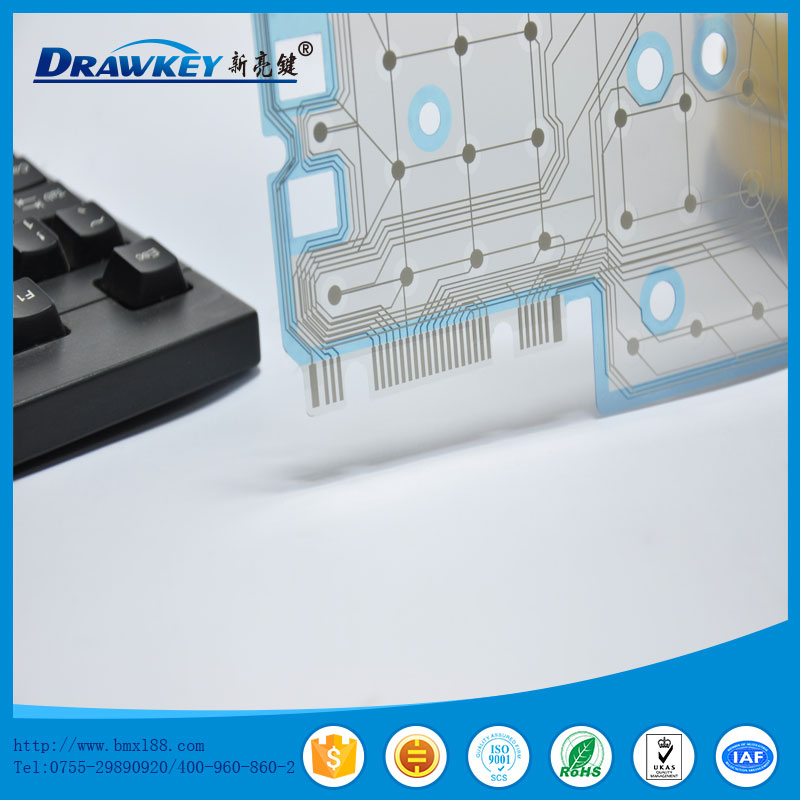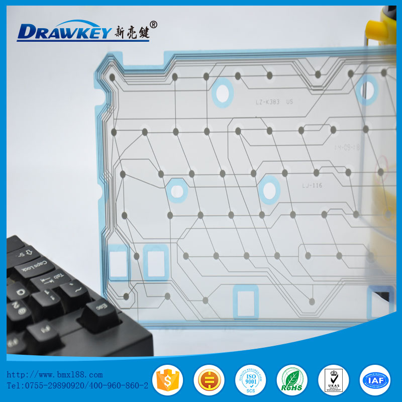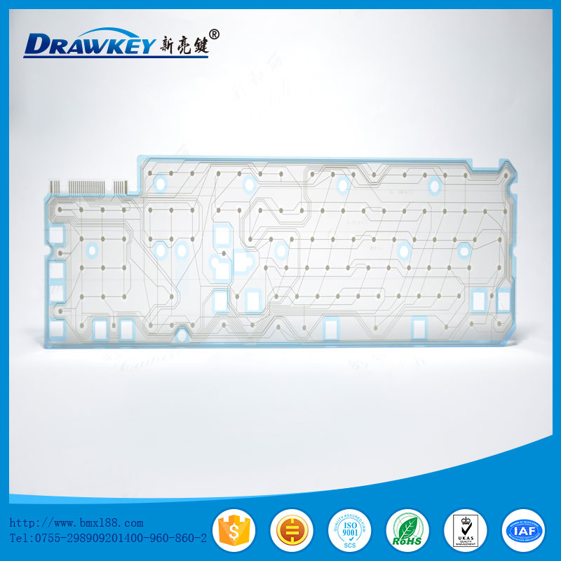 - 防水電腦鍵盤導(dǎo)電膜規(guī)格: 1.銀線設(shè)計(jì)及印刷寬度:4mm(特殊走線密度大按照客戶要求設(shè)計(jì));最小間隔0.3mm,線路毛邊<1/3,線路缺口<1/4 2.銀線印刷厚度:3~5um 3.銀線回路電阻800~1000Ω 按照客戶要求訂制 4.按鍵開關(guān)壽命:>100萬次 5.鍵標(biāo)作力:15~750g力