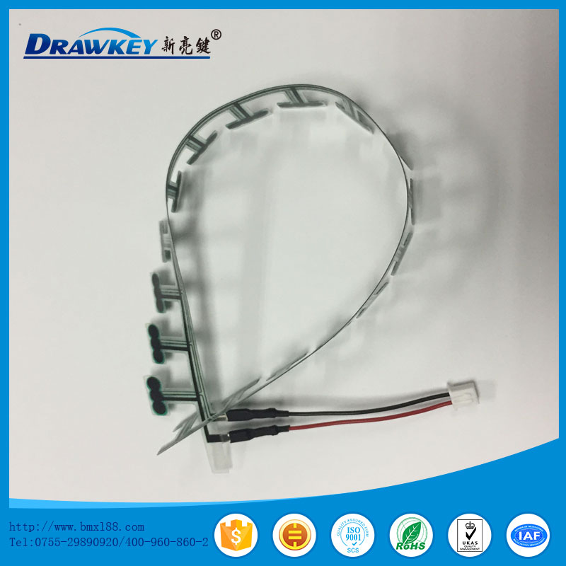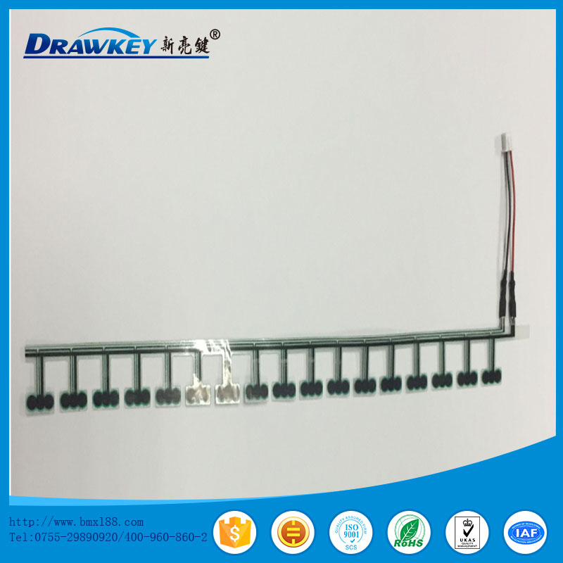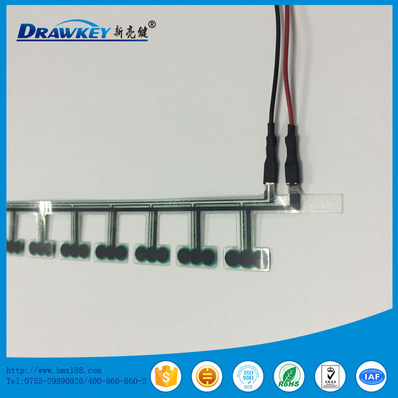 產(chǎn)品規(guī)格:使用PET 印刷銀線、碳線,形成薄膜開關按鍵。電阻值小于100Ω。符合ROHS標準。
