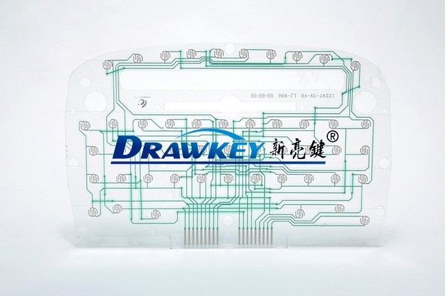 玩具薄膜線路是一種以PET薄膜為基材制成的柔性線路板,并具有可撓性。三層設(shè)計(jì),上、中、下三層導(dǎo)電膜,上、下層分別印有電路連線及按鍵觸點(diǎn),中間隔層上有上、下觸點(diǎn)層對(duì)應(yīng)的圓孔,隔層的作用是防止上下層電路短路。